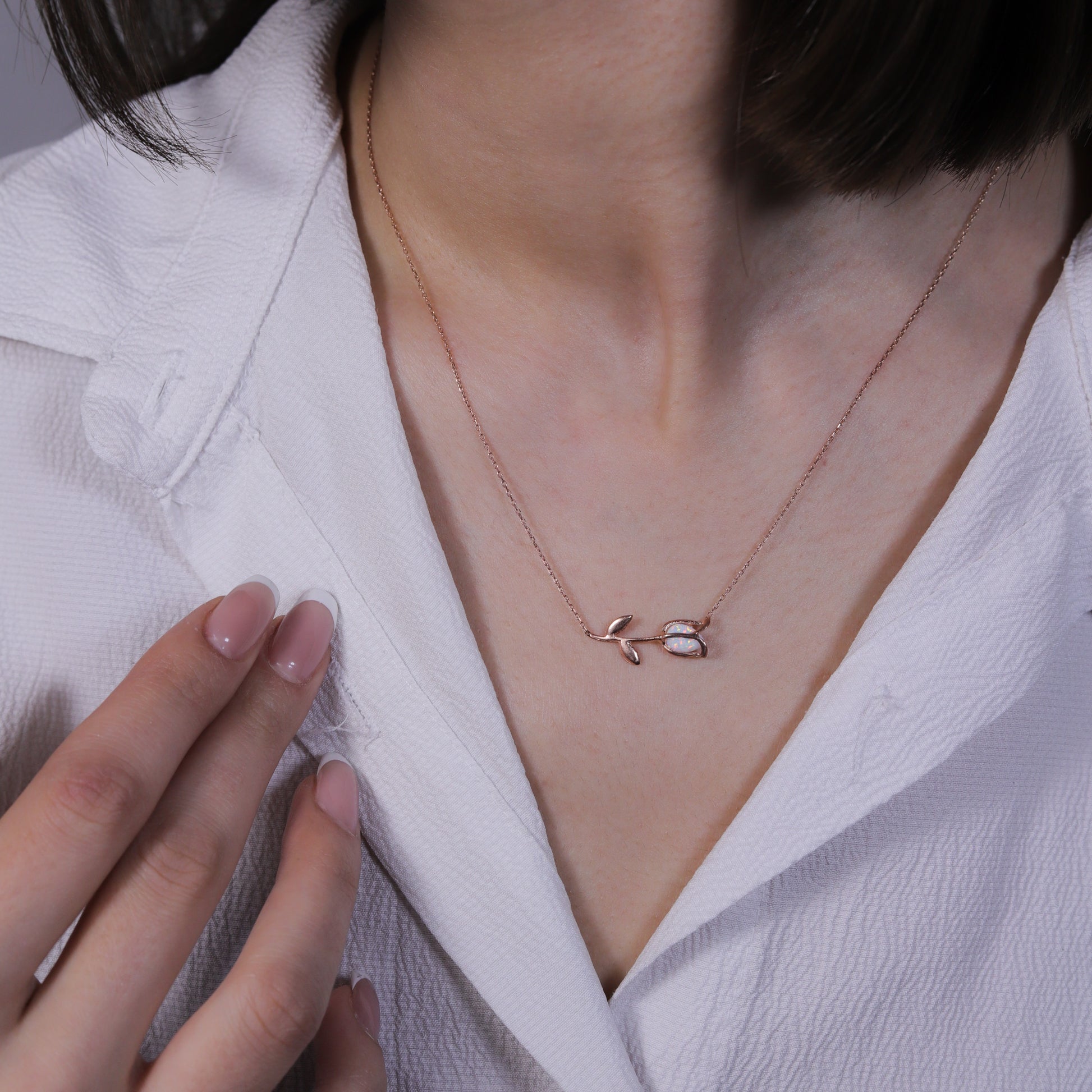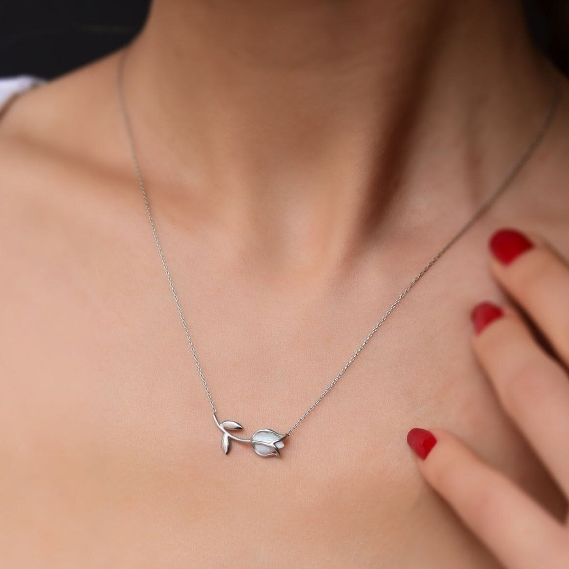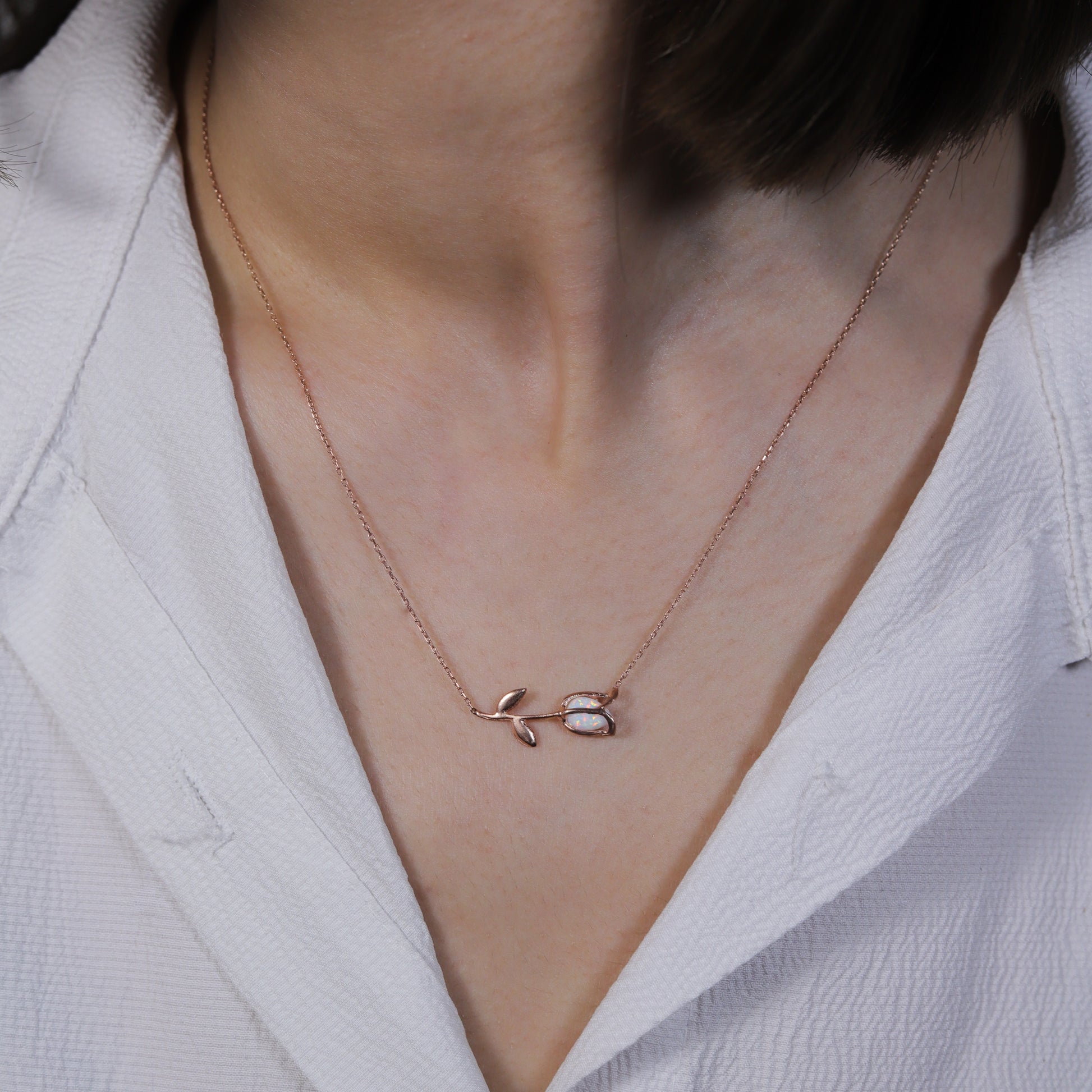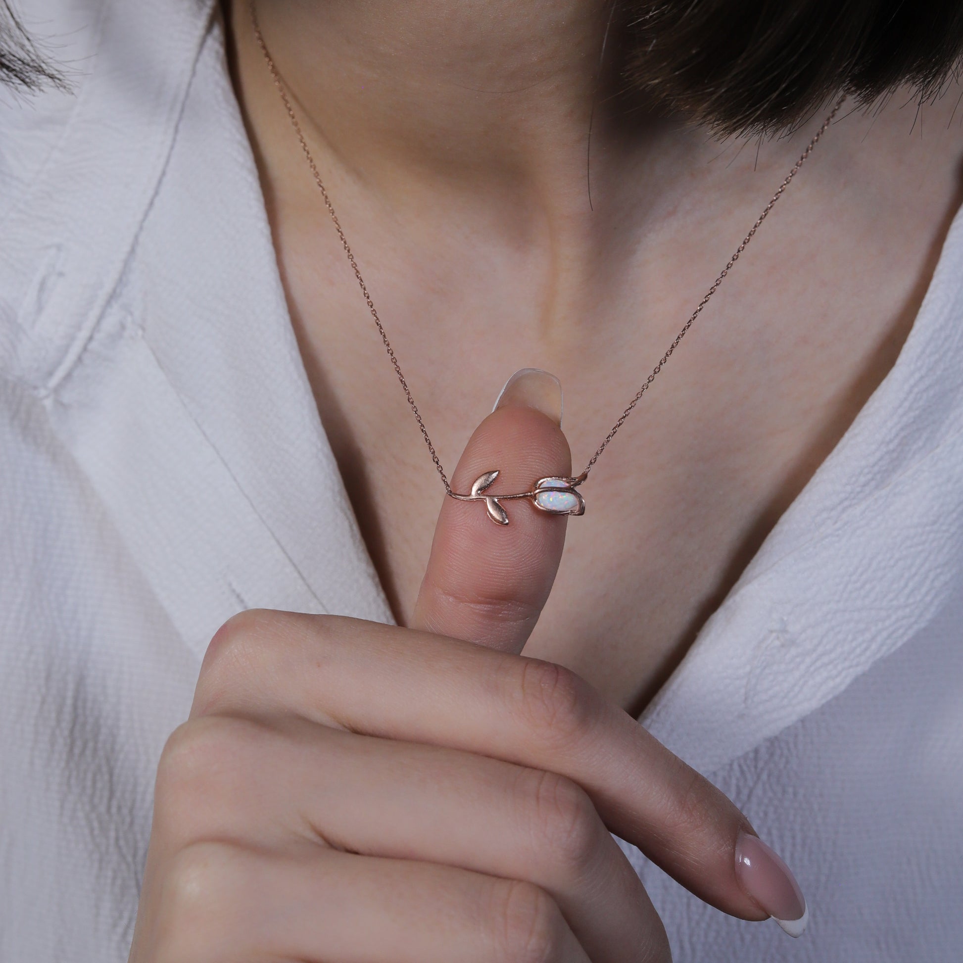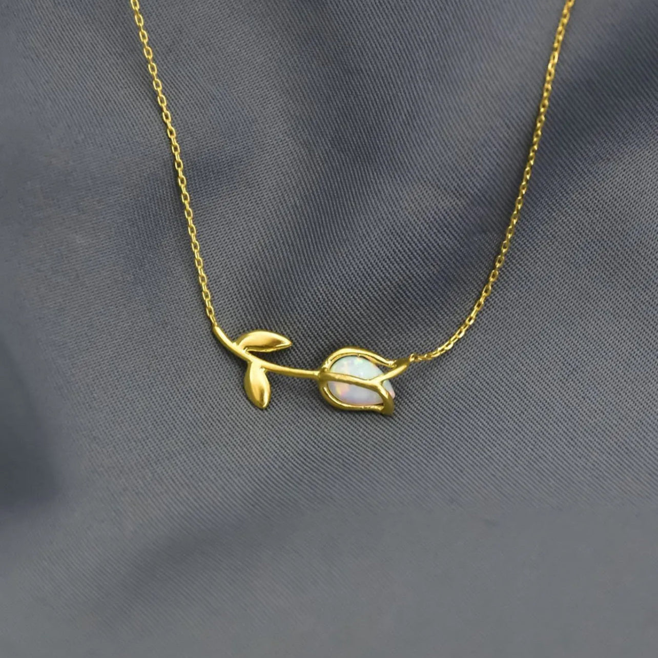 925 Ayar Gümüş Beyaz Opal Taşlı Lale Kolye