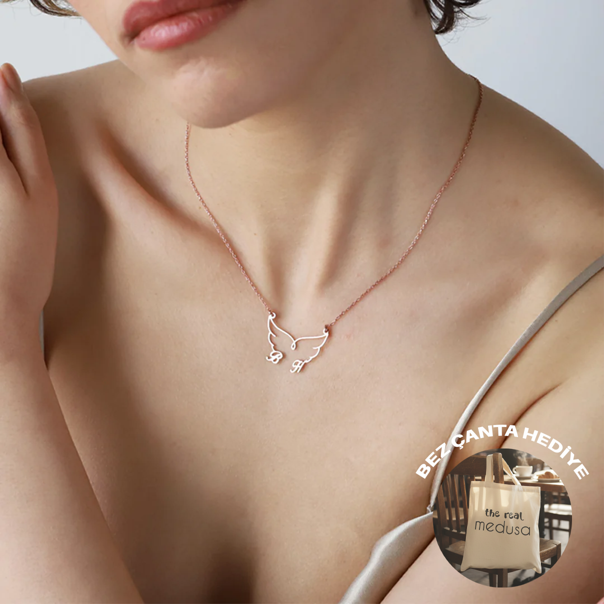 Kişiye Özel Çift Harfli Melek Kanadı Kolye 925 ayar gümüştür. Kolyenin rengi rose gold olup zincir uzunluğu 45 cm'dir. Kişiye Özel Çift Harfli Melek Kanadı Kolye'nin kanat kısmında bulunan harfleri talebinize uygun olarak kendi atölyemizde profesyonel kişiler tarafından özenle sizler için hazırlıyoruz. Bu modelimiz, sizin ve sevdiklerinizin baş harfleri ve melek kanadı figürlerini harmanlanıp özenle birleştirilmesi sonucu üretilmiştir. İlk gördüğünüz andan itibaren kalbinizin yerinden uçup gitmesini sağlayan kıymetliniz için eşsiz bir hediye olacaktır.